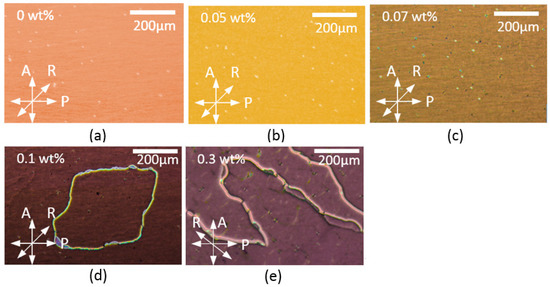 POM photographs of LC cells doped with GNP concentrations of (a) 0 wt %, (b) 0.05 wt %, (c) 0.07 wt %, (d) 0.1 wt %, and (e) 0.3 wt %.