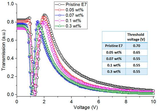 the threshold voltage (Vth) of the LC cell is proportional to the square root of the elastic constant K and is inversely proportional to the square root of the dielectric anisotropy Δε. The nematic-isotropic transition temperature of pristine E7 is 62 °C, whereas that of LC mixture with GNP concentration of 0.3 wt % is 44 °C. This indicates that doping GNPs markedly decreases the order parameter of NLCs. As is well known, the elastic constant is proportional to the square of the order parameter S, indicating that the addition of GNPs also decreases the elastic constant of the LCs. Furthermore, the dielectric anisotropy of LCs was obtained by the dielectric spectrum measurement. The measured dielectric anisotropies of LCs doped with GNP concentrations of 0, 0.05, 0.07 and 0.1 wt % are 12.62, 12.99, 13.02 and 13.32, respectively. The dielectric anisotropy of NLCs slightly increases with GNP doping. Accordingly, the reduction of threshold voltage of the LC cell is related to the simultaneously decreased elastic constant and increased dielectric anisotropy of the LC mixture. As shown in Figure 2, the transmissions of the pristine LC and 0.05 wt % GNP-doped cells initially rise and then decline with the supplied voltages, whereas those of the other cells decline directly with the supplied voltage. This indicates that the phase retardations of the pristine LC and 0.05 wt % GNP-doped cells are slightly larger than those of the other cells. The differences in phase retardations may also be caused by the slightly cell gap errors. Notably, the doped GNPs may also disorder the LC alignment, and hence reduce the threshold voltages and phase retardations of the LC cells. If cell gap errors are ruled out, the birefringence of NLCs can be evaluated by the T–V curve, indicating that the birefringence of NLCs with GNP concentrations of 0, 0.05, 0.07, 0.1 and 0.3 wt % are 0.19, 0.19, 0.17, 0.17 and 0.18, respectively. With GNP dopant, the slight decrease in birefringence of NLCs possibly originates from the disorder of the LC alignment.