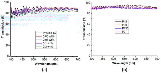 (a) Transmission spectra of the pristine E7 and GNP-doped LC cells. (b) Transmission spectra of the 0.3 wt % GNP-doped LC cell with incident light at the polarization directions of 0° (rubbing direction), 45°, 90° and 135°, respectively.