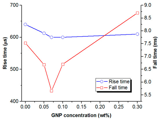 Response time is also an important index for the performance of the LC devices. In this study, the rise (fall) time is defined as the time required for the transmission change of the LC cell when the voltage is suddenly turned on (off) from 2 V to 10 V (10 V to 2 V). As observed in Figure 4, the rise and fall times decrease with increasing GNP concentrations. According to Equations (2) and (3) [26,27], for small LC reorientation angles with the supplied voltage slightly above Vth, both rise (τr) and fall (τf) times of the LC cell can be estimated by the effective rotational viscosity ηi,