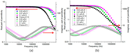 To analyze the dielectric relaxation of the LC mixture, the vertically aligned LC cell was constructed with two ITO glass substrates that were coated with vertical PI. Figure 5 shows the dielectric spectra of the pristine E7 and GNP-doped LC cells at various GNP concentrations. In the homogeneously aligned cell, the direction of the LCs is parallel to the substrate surface, and is thus perpendicular to the direction of supplied electric field. In contrast, in the vertically aligned cell, the direction of the LCs is perpendicular to the substrate surface, and is thus parallel to the direction of supplied electric field. When a dielectric medium is supplied with an external electric field, it attains a new equilibrium state through dielectric relaxation. Dielectric relaxation is a reflection of the fact that electric displacement requires a finite time to reach equilibrium. To confirm the relaxation mode, the dielectric spectra of the empty cell were measured, indicating that the relaxation frequency of the empty cell appeared at ~107 Hz, which was the cell relaxation originating from the finite resistance of the ITO electrode and the inductance of connecting wires used in the cell [28,29]. Furthermore, as demonstrated in the literature [30,31], in a homogeneously aligned cell filled with pristine E7, the relaxation frequencies of the cell without and with voltage (40 V) supplied were observed at ~1 MHz and ~105 Hz, respectively. The relaxation frequency at 1 MHz was attributed to the LC reorientation along the long axis, and that at 105 Hz was mainly attributed to the LC reorientation along the short axis. Once the supplied voltage was higher than 40 V, or the pristine E7 was placed in a vertically-aligned cell, the relaxation frequency decreased further. As shown in Figure 5, it was obtained that the relaxation frequency of the homogeneously aligned cell occurred at ~1 MHz, whereas that of the vertically aligned cell occurred at 7.6 ×104 Hz. Notably, the relaxation frequency was significantly dependent on the temperature [32].