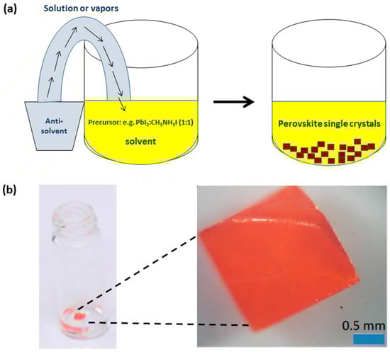 (a) A schematic diagram of a typical, anti-solvent crystallization process for MAPbI3 perovskite formation. (b) A vial containing an orange single crystal of MAPbBr3, grown by the anti-solvent (IPA) crystallization method and optical microscope image of the crystal. Reprinted with permission from [21]. Copyright (2014) American Chemical Society.