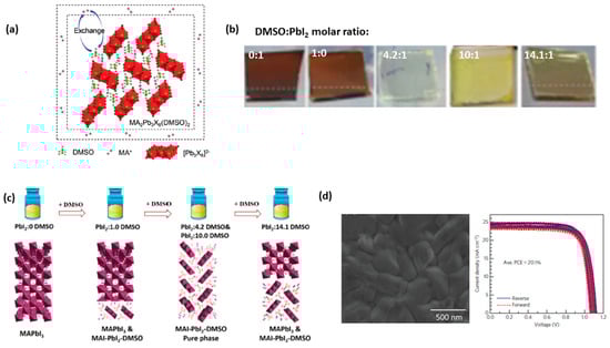 From the above works, an open question unveiled concerning whether the MAI:PbI2:DMSO ratio should remain exactly at 1:1:1 in order to form the MA2Pb3I8(DMSO)2 intermediate. Indeed, Bai et al. systematically manipulated the composition of intermediate perovskite films aiming to optimize the perovskite layer for highly efficient solar cells. By carefully controlling the ratio of DMSO:PbI2 in the perovskite precursor, a pure MA2Pb3I8(DMSO)2 intermediate phase was obtained at the DMSO:PbI2 ratio of 10.0:1 (Figure 4b,c) [31]. In other works, perovskite solar cells prepared by the precursor solution of PbI2:MAI:xDMSO (x = 2.0 [32] or x = 1.5 [33]) exhibited the highest reproducibility and efficiency (compared to the standard 1:1:1 ratio). Quite importantly, the presence of the intermediate was also confirmed during DMSO solvent annealing of a MAPbI3 perovskite film; DMSO vapors react with MAPbI3 to form a MA2Pb3I8(DMSO)2 intermediate at grain boundaries between perovskite crystalline domains. The decomposition of the intermediate can facilitate the grain boundary migration. As a result, the overall crystal size of MAPbI3 crystalline domains increases substantially [34].