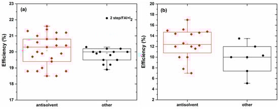 Overall photovoltaic efficiencies of (various types of) perovskite solar cells with perovskite films fabricated via a combined intermediate/anti-solvent crystallization method: (a) solar cells based on pure Pb2+ perovskite and (b) solar cells based on mixed Pb/Sn perovskites. Note that in the case of pure lead perovskite solar cells, only efficiencies higher than 18.5% were introduced in the statistical analysis. Data were taken from the references existing in the present manuscript.