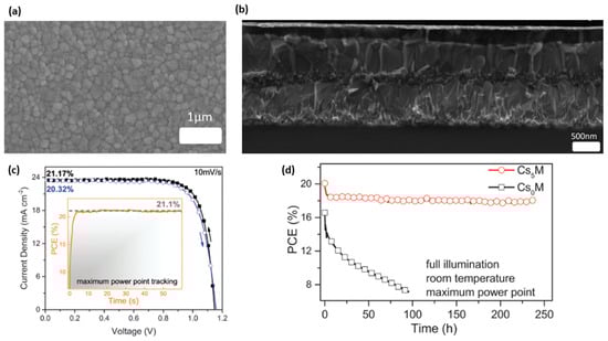 (a) Top (b) and cross-sectional view scanning electron microscope (SEM) images of the Cs-doped FAMA perovskite films and the whole meso n-i-p devices, respectively. (c) Forward and reverse scanned J-V curves under 1 sun illumination and stabilized output power characteristics recorded for 60 s. (d) Aging for 250 h of devices with (Cs5M) or without Cs+ (Cs0M) in a nitrogen atmosphere held at room temperature under constant illumination and maximum power point tracking [45]. Published by The Royal Society of Chemistry.