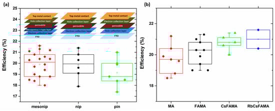 Overall photovoltaic efficiencies of perovskite solar cells with various mixed (or not) perovskite films fabricated via a combined intermediate/anti-solvent crystallization method: (a) mesonip, nip and pin cells refer to a specific architecture depicted in the figure as an inset. See text for further details. (b) MA, FAMA, CsFAMA and RbCsFAMA refer to compounds consisting of pure MAPbI3, mixed FAPbI3-MAPbI3, Cs+-doped mixed FAPbI3-MAPbI3 and Rb+/Cs+-co-doped mixed FAPbI3-MAPbI3, respectively. Note that various types (meso n-i-p, n-i-p and p-i-n) of highly efficient (over 18.5%) solar cells are included in the statistical analysis. Data were taken from the references existing in the present manuscript.