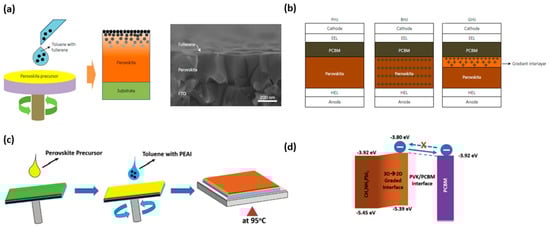 A unique approach was applied during anti-solvent crystallization by Bai and coworkers [59]. The authors slowly dripped a TL solution of phenethylammonium iodide (PEAI) during spin-coating a MAPbI3 solution in DMF:DMSO (2:7 v/v) co-solvent onto NiO substrate (Figure 8c). PEA+ is a large cation that cannot preserve a 3D perovskite structure; instead, when reacting with PbI2, it forms a 2D PEA2PbI4 perovskite [60].