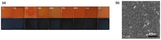In the second work, a much larger variety of anti-solvents were dripped on a PbI2-excessive perovskite precursor solution, spin-cast on m-TiO2 substrates (Figure 10a). Interestingly, alcohols such as isobutyl alcohol (IBA) and IPA worked quite efficiently, producing PCEs of 15.8% and 14.8%, respectively. However, the most amazing feature of the work was that ethyl acetate (EA) worked even better than CB, producing pinhole-free films composed of big crystalline grains and reduced number of grain boundaries (Figure 10b). Devices fabricated using the above films, exhibited record PCEs of 19.4%. Again, we should also emphasize the fact that all anti-solvents were dripped in an exactly similar manner [66]. The viability of EA as an anti-solvent was already confirmed by others [67,68,69].
