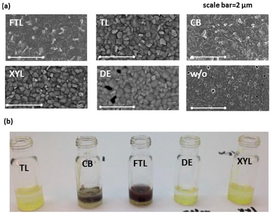 (a) SEM images of perovskite films treated (or not) by various anti-solvents (trifluorotoluene: FTL, toluene:TL, chlorobenzene: CB, xylene: XYL, diethyl ether: DE); (b) Photograph of adding anti-solvents into precursor solutions. Reproduced from Ref. [70] with permission from American Chemical Society.