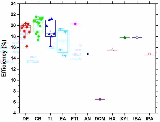 Besides xylene, another solvent (hexane, HX), which is also immiscible with both DMF and DMSO, gave appreciable photovoltaic efficiencies (15.5%). Certainly, these values were increased up to 16.5% when a solvent miscible with DMF (DE) was added in a 50–50 ratio [71]. Another interesting co-solvent system (6% IPA in CB) assisted to get an even higher PCE (19.2%) when dripped on a CsFAMA precursor perovskite film [72]. In the following Figure 12, we summarize all the PCEs attained using various anti-solvents in literature thus far.