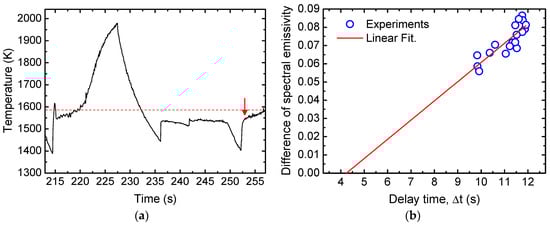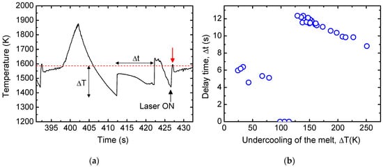 (a) Time-temperature profile of a CoSi-62 at. % alloy with a short delay time. No temperature drop (marked by a red arrow) is observed on the subsequent heating curve. (b) Relation between delay time and change of spectral emissivity. The emissivity change for the temperature drop was calculated by assuming the emissivity of the liquid phase to be 0.25.