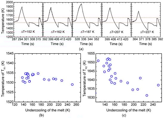 (a) Illustration of time-temperature profiles for different undercoolings. Changes of the recalescence temperature for (b) primary (CoSi2) and (c) secondary (CoSi) phases as a function of undercooling of the melt.