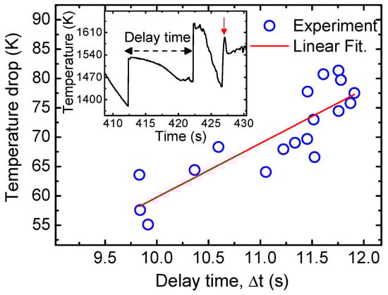 Unlike the primary recalescence temperature, that of secondary CoSi phases decreases with higher undercoolings, as shown in Figure 2c. Moreover, it is found that the degree of the temperature drop on the heating process is proportional to the delay time (thus undercooling), as shown in Figure 3. This relation means that the emissivity change occurs during the delay period prior to secondary recalescence and thus is likely associated with the accumulation of surface roughness.