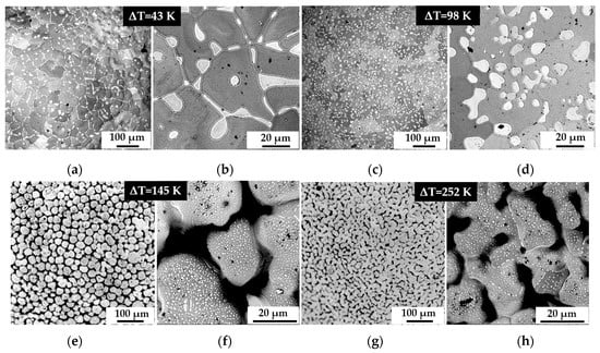 Back-scattered SEM micrographs for the surface of CoSi-62 at. % alloys processed (radiatively cooled) in the ESL. (a,b) Low (ΔT = 43 K, Δt = 4.57 s), (c,d) medium (ΔT = 98 K, Δt = ~0 s), (e,f) high (ΔT = 145 K, Δt = 12.13 s), and (g,h) high (ΔT = 252 K, Δt = 8.88 s) undercoolings.