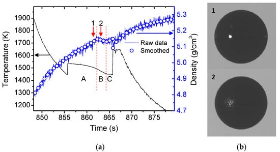 (a) Time-density and time-temperature profiles of a CoSi-62 at. % melt during solidification. The density shows a distinct behavior dependence on delay time. (b) Video images captured at A and B regions. The corresponding times to the images are 861.4 s and 863.1 s for points 1 and 2, respectively.