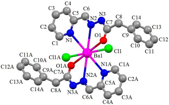The studies on structures and properties of metal complex materials have achieved much attention in the past decades [1,2,3,4,5], because they show attractive applications in many ways such as magnetic properties [6,7,8], fluorescence [9,10,11,12], catalytic activities [13,14,15], pharmacological activities [16,17,18], and so on. However, to best of our knowledge, the structure and property of alkaline earth metal complexes have not been studied extensively comparing to transition metal complex. In recent years, our group have synthesized and structurally characterized some alkaline earth metal complexes [19,20,21,22,23,24,25,26,27]. In order to further investigate the structure and property of alkaline earth metal complexes, a novel Ba (II) complex with pyridine-2-carboxaldehyde-2-phenylacetic acid hydrazone (L), [BaL2Cl2] (1) has been synthesized and characterized. The catalytic activity of Ba(II) complex has also been investigated. The chemical diagram of the Ba(II) complex is shown in Scheme 1.
