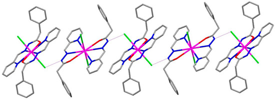 The Ba(II) complex crystallizes in monoclinic system with space group P21/c. There are one Ba(II) ion, two pyridine-2-carboxaldehyde-2-phenylacetic acid hydrazone ligands, two Cl− in the complex molecule. Figure 1 shows the coordination environment of Ba(II) ion in the complex. As shown in Figure 1, the Ba(II) ion is eight-coordinated with four N atoms and two O atoms from two different pyridine-2-carboxaldehyde-2-phenylacetic acid hydrazone ligands and two Cl−, forming a distorted doubly-capped octahedral geometry. The dihedral angle between the pyridine ring (N1-C1-C2-C3-C4-C5) and benzene ring (C9-C10-C11-C12-C13-C14) is 76.2°, showing that the hydrazone molecule is non-planar. In the crystal packing, the complex molecules form 1D chained structure by the intermolecular hydrogen bonds (N-H···Cl) present between the pyridine-2-carboxaldehyde-2-phenylacetic acid hydrazone ligand and coordinated Cl− (Figure 2), or by the π···π stacking interactions of pyridine rings (Figure 3). Meanwhile, hydrogen bonds and π···π stacking interactions of pyridine rings and benzene rings assemble the 1D chains into a 3D network structure (Figure 4). The important bond lengths and bond angles are shown in Table 1.