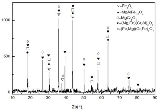The chromite concentrate sample originated from South Africa and provided by Jinzhou Company in Liaoning Province, China. The brief chemical components of chromite analyzed by inductively coupled plasma optical emission spectrometry (ICP-OES) and the results listed in Table 1. Phase analysis of the chromite concentrate was performed with the XRD (Bruker, Billerica, MA, USA; CuKα, wavelength: 1.5405980) and the patterns were shown in Figure 1. The SEM images of the chromite concentrate were recorded using JSM-35CF SEM equipment (JAPAN Electron Optics Laboratory Co, Ltd., Tokyo, Japan) and shown in Figure 2. The particle size distribution was measured using particle size analyzer (LS230, Beckman Coulter, Brea, CA, USA).