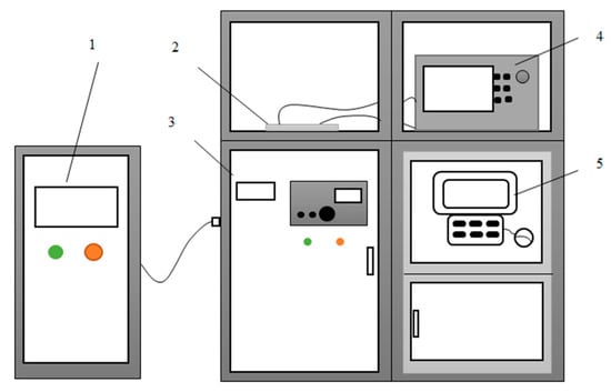 The structure diagram of dielectric constant measurement device (1-water cooling system, 2-reaction system, 3-control system, 4-microwave network analyzer, 5-PC collection system).