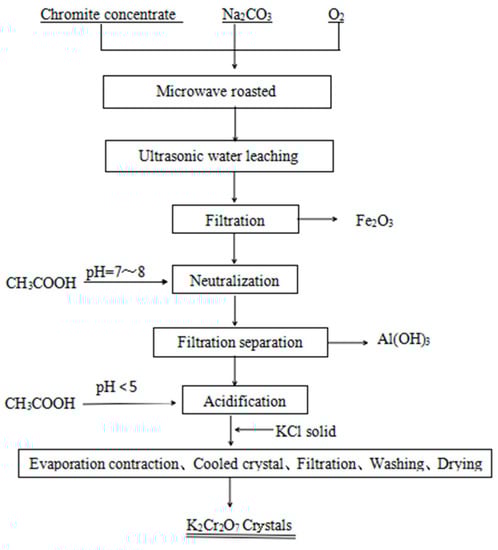 All experiments were carried out in a microwave oven, which was developed by Kunming University and it has a good performance. Its adjustable power range was 0–6 kW, microwave frequency was 2.45 GHz; with a tungsten-rhenium thermocouple (measuring temperature range: 0–1800 °C). The particle size of chromite was 74 μm and it was measured using particle size analyzer. The chromite powder (50 g) and sodium carbonate (50 g) separately heated in microwave heating furnace (frequency 2.45 GHz, power 1.5 kW) using silicon carbide crucible. Similarly, chromite and sodium carbonate mixed (weight ratio of 1:2) and roasted using a microwave oven for 30 min at 750 °C. Thus, the obtained sample contains Fe3O4, Fe2O3, NaAlO2, and Na2CrO4. The sample was ground, water added and ultrasonic extraction carried to remove Iron particles. Then the iron-free sample was neutralized (pH: 7 to 8) using glacial acetic acid to leach out the aluminum particles. Further, glacial acetic acid was added (pH: 5) in order to convert CrO42− into Cr2O72−. Then the KCl solution added and heated. When crystals precipitation appeared, the heating stopped and crystals washed to remove KCl in a hot environment. Afterwards, the filtrate cooled and transferred into the ice bath. Then a large amount of K2Cr2O7 formed [29]. It washed with ice water, at this time because K2Cr2O7 has a relatively large solubility and retained in the filtrate. Finally, the orange-red crystals obtained (Figure 4).