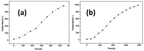 Temperature rise characteristic curves in the microwave field of chromite (a) and Na2CO3 (b).
