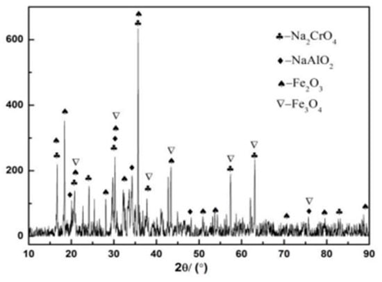 Figure 9 shows the XRD pattern of the product after microwave roasted. The FeO·Cr2O3 and Na2CO3 reacted chemically producing Na2CrO4. Additionally, Al2O3 and Na2CO3 reacted to generate NaAlO2. At the same time, Fe2O3 also existed.