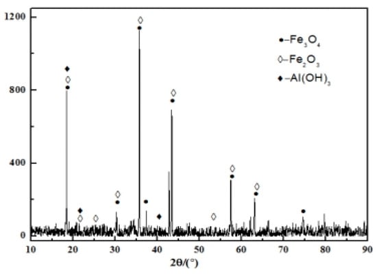 Figure 10 shows the XRD pattern of slag after ultrasonic extraction, which shows the existence of Fe2O3, Fe3O4 and Al(OH)3. Compared to the XRD patterns of chromite concentrate before microwave roasted and ultrasonic extraction, only Fe2O3 and Fe3O4 are existing. Other components removed.