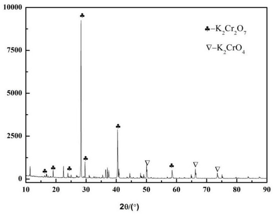 According to the formula of (2)–(4), the purity of final K2Cr2O7 product was calculated. After microwave roasted and ultrasonic extraction, the purity of the product is up to 67.4%, compared with the conversion rate of Cr after microwave roasted that is a little bit down. Since the acidity has not been controlled ideally, the Na2CrO4 having not been completely transformed into Na2Cr2O7. Therefore, the final product K2Cr2O7 includes small amount of K2CrO4.
