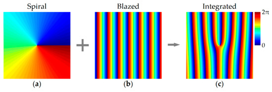 The first term on the right-hand side describes a spiral phase, where m denotes the topological charge and exhibits the local azimuthal angle in the x-y plane. The second term describes the introduced blazed phase, where Λ is the pitch. The calculated phase distributions of a spiral phase, a blazed phase and their integration with m = 1 and Λ ≈ 1.2 mm are shown in Figure 1a–c, respectively. It can be seen that the integrated phase is fork-like, with a space-variant change.
