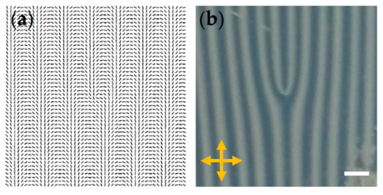 (a) The scheme of the director distribution of an LC FPG with m = 1 and Λ ≈ 1.2 mm; (b) corresponding photo under crossed polarizers; the scale bar is 1 mm.
