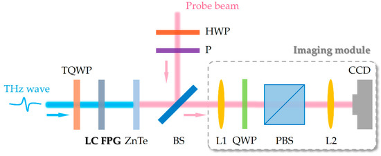 To characterize the performance of the THz LC FPG, a THz digital holographic imaging system [35] is utilized, as schematically depicted in Figure 3. A linearly polarized THz beam with 3 mm diameter is excited and collimated to pass through a 1 THz quarter-wave plate (TQWP), which is used to control the incident polarization, and then illuminates on the center of the LC FPG sample. By employing a half-wave plate (HWP) and a polarizer (P) to adjust the probe polarization in the path of the probe beam, we can measure different polarization components of the emerging THz waves. The probe beam is reflected onto the ZnTe crystal (i.e., detecting crystal) by a 50/50 non-polarization beam splitter (BS). In the detection crystal, the probe polarization is modulated by the THz field to carry two-dimensional THz information, due to a linear electro-optic effect. The reflected probe beam is sent into the imaging module of the system, which consists of a QWP, a Wollaston prism (PBS), two lenses (L1 and L2), and a CCD camera with a 4 Hz frame rate for measuring the variation in the probe polarization, which is synchronous with the THz beam pumping. The imaging module can capture the image of the probe beam and extract the two-dimensional THz information by using dynamic subtraction and balanced electro-optic detection techniques [36,37]. A series of THz images in the time domain is acquired, and subsequently, the amplitude and phase information of each spectral component can be extracted by implementing Fast Fourier transformation.