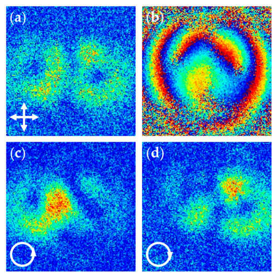 (a) Intensity and (b) phase distribution of the detected vertically polarized components of the diffracted beams at 1 THz for horizontally polarized incident; the measured intensity pattern for vertical polarization component for (c) LCP and (d) RCP incident THz beam.