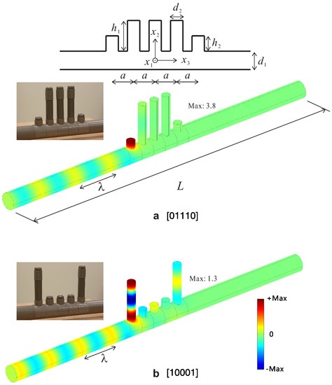 An acoustic system composed of a sequence of five short or long tubes grafted onto a waveguide. The displayed sequences are denoted by (a) [01110] and (b) [10001], where 0 or 1 represent either a short or a long tube. The distance between adjacent tubes is a. Photographs of the actual samples are shown as insets. Numerical simulations illustrating transmission cancellation are shown at the resonance frequency of (a) the short tube ( Hz) and (b) the long tube ( Hz). The color-bar indicates the amplitude of the pressure field normalized to the maximum pressure (Max). is the wavelength at the considered frequency. Dimensions in the experiment are m, cm, cm, cm, cm, and cm.