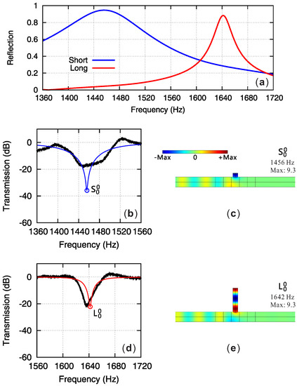 Considered separately, a single grafted tube mostly acts as a localized and strongly dispersive mirror having a reflection coefficient peaking almost at unity at the resonance frequency. Actually, unit reflection would be obtained in the absence of loss. Figure 3a shows the computed reflection coefficient for a single short or long tube in the frequency range of interest. At the fundamental resonance ( Hz) of the short tube, the reflection coefficient of the long tube is quite small (). This implies that the long tube has a small impact on transmission at the fundamental resonance of the short tube. In contrast, at the third resonance ( Hz) of the long tube, the reflection coefficient on the short tube retains a significant value (). Similarly, this implies that the short tube could have a noticeable impact on transmission at the resonance of the long tube. Thus, when one type of tube is at resonance, the other type is not, but its presence still cannot be completely neglected.