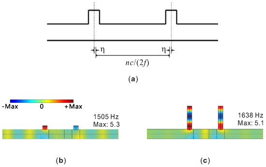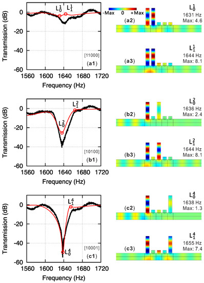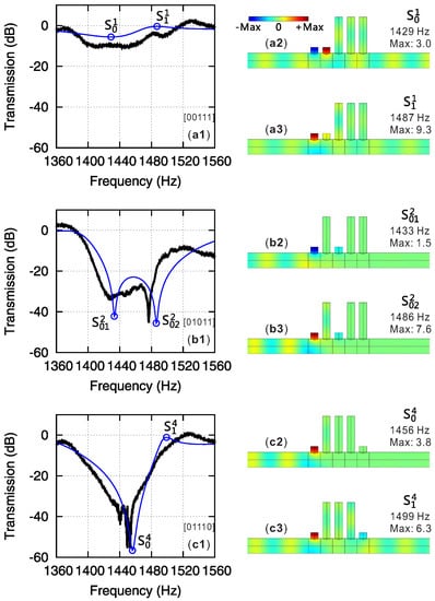 When considering a larger separation () between short tubes, such as for sequence [01110], it is expected that the near-field coupling that is due to evanescent waves gets smaller and eventually vanishes exponentially, in accordance with Table 1. The transmission spectra in Figure 4c start to assume an asymmetric Fano-like shape [23,24] instead of the simpler Lorentzian shape observed for smaller separations. More precisely, this shape is characterized by the simultaneous presence of a transmission dip centered near the resonance frequency of the single tube and of one or more transmission units. At the transmission dip , it can be observed in Figure 4(c2) that acoustic waves localize on the first tube while the second tube remains almost idle. This property was checked to remain true for larger separations. At the transmission unit , both short tubes are rather strongly excited in Figure 4(c3) and a standing wave establishes between them. Similar observations can be made regarding the transmission spectrum, the transmission dip , and the transmission unit in Figure 5c.