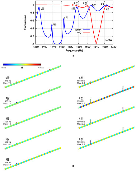 Figure 7 shows transmission spectra in the case that . This distance is m, about 10 times larger than the wavelength ( m). In this case, the two resonators could naively be supposed to be insensitive to one another. In fact, coupling of their evanescent fields can safely be ignored, but interference of reflected guided waves can still occur. Figure 7a shows transmission spectra for pairs of short or long tubes. The series of transmission units is seen to be given with a good approximation by formula (9). The sequence of states to are actually associated with the values to 24. The sequence of states to also correspond to to 24. The pressure distributions for all these states are plotted in Figure 7b. FP oscillations with enhanced amplitude can clearly be seen to extend between the two resonating tubes.