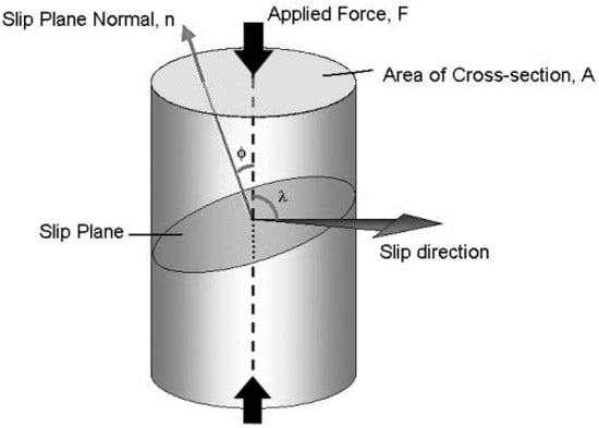 The slip direction is shown in Figure 1 if the slip occurs on the plane that is shown in the schematic with plane normal n. The resolved shear stress acting parallel to the slip direction on the slip plane, τR, can be calculated using the following equation []: