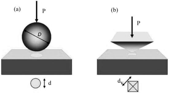 Hardness testing is performed to estimate the materials’ ability to resist plastic flow under applied load. However, the measurement of H depends on the method one chooses and is influenced by both the elastic and plastic nature of materials. Depending on the forces applied and displacements obtained, the H measurements can be defined as micro-, nano-, or macrohardness. While measuring macrohardness is very simple for bulk materials, thin films and microstructured materials require H measurement techniques at micro/nanoscale []. While the electromagnetic, ultrasonic, and rebound techniques are used to measure materials’ hardness, indentation testing has received considerable attention because it is non-destructive and provides reliable and straightforward data. Indentation (penetration of a hard material, typically a diamond with a known geometry, into the sample) tests were first performed by Brinell [], who used spherical balls (as shown in Figure 2a) from hardened steel ball bearings or made of cemented tungsten carbide to quantify the plastic properties of materials in 1900. Brinell’s work was then followed and improved by Meyer [] in 1908.