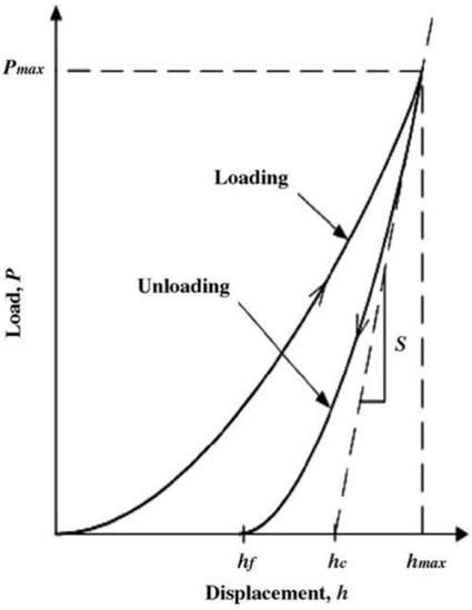 where hmax is the maximum indentation depth, and 0.75(P/S) denotes the extent of the elastic recovery (he) [,]. Here, the stiffness S = dP/dh and ε is a constant that depends on the indenter geometry. The values of ε are 0.72, 0.75, and 1.00 for conospherical, Berkovich, and flat punch tips, respectively.