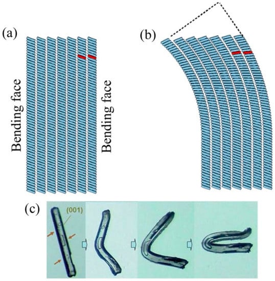 Plastic bending experiments were conducted by Reddy et al. [,,] to understand the plastic behavior of organic crystals, and they observed that molecular crystals undergo plastic deformation if and only if the intermolecular interactions strength in orthogonal directions is significantly different, and that there exists a correlation between bending and crystal packing (see Figure 4a,b). Based on that observation, molecular crystals were classified as plastic or brittle, and a model was developed for bending crystals. While the former crystals are bendable, the latter cannot be deformed plastically. Further, Reddy and Naumov [] studied the plastic deformation mechanism in hexachlorobenzene crystals and observed changes in the unit cells parameters in the region of deformation, as shown in Figure 4c. In contrast to inorganic plastic materials, such as metals etc., no volume change including dimensions of crystals and thickness was observed following the bending of molecular crystals. However, crystals that have “cross-linked” intermolecular interactions in three orthogonal directions are hard and brittle. Recently, Sajesh et al. [] examined the plastic bending mechanism in Dimythl Sulfone (DMS) using a new bending model that provides quantitative rationalization based on differential binding and the stacking of molecular layers in orthogonal directions.