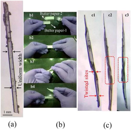 (a) As-grown crystal before performing the twist experiment. (b1–b4) Twisting mechanism of the butter paper encapsulated crystal by hand. (c1–c3) The hand-twisted helical crystal, as seen from different angles. The twisting at the middle is marked with red dotted lines. (Reproduced with permission from the American Chemical Society, Reference 64).
