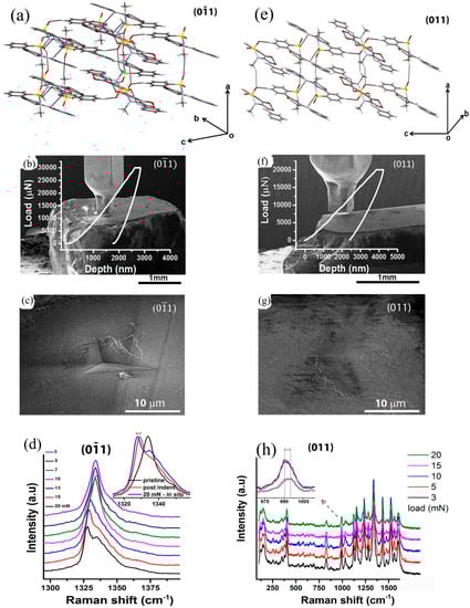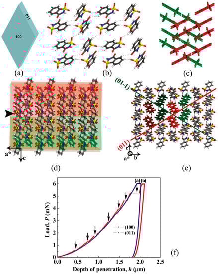 Kiran et al. [] used the instrumented nanoindentation technique to investigate the mechanical anisotropy and correlate with the intermolecular interactions in saccharin crystals. The active slip system in the saccharin crystal is (100) [011]. Both the (100) and (011) faces were indented with a Berkovich nanoindenter with an in-situ scanning probe microscopy (SPM) imaging capability. On the [100], the molecules (as centrosymmetric NH···O dimmers) stacked down, and make an oblique angle to the (100). Further, the molecules within stacks were stabilized through weak π···π interactions, and adjacent stacks were bound by the CH···O bonds. In contrast, in the (011) plane, stacked dimmers were arranged in a crisscross arrangement and CH···O bonds were arranged at 90° to the (011) (see Figure 6a–e). During indentation, while the loading part of the P-h curve of the (011) face was smooth, several distinct pop-ins were evident on the (100) face, as shown in Figure 5f. Interestingly, the first pop-in width (18 nm) was found to be the integral multiples of the interplanar spacing which was explained using the contact mechanics of a spherical indenter []. Further, the plastic deformation was seen on both the faces, even at a load of 0.01 mN, due to the sharp geometry of the indenter tip. While the homogeneous plastic deformation on the (011) face was attributed to the existence of several slip systems that are nearly parallel to the plane of the indentation direction, the discrete plasticity on the (100) was due to the lowest attachment energy slip planes, which act as cleavage planes and are prone to pop-ins due to their higher compressibility. The occurrence of pop-ins on (100) plane was attributed to the disruption of CH···O hydrogen bonds followed by an elastic compression of stacked columns through weak π···π interactions []. As a result, the columns broke away. Further, the relationship between the pop-in magnitude and the interplanar spacing was observed and rationlized the results with the aid of indentation contact mechanics. Interestingly, the pop-in magnitude measured to be the intergral multiples of the interplanar spacing. At the higher loads, anisotropic cracking was evident on the (100) planes along the corners of the sharp indenter. Furthermore, pile-up inhomogeneity around the residual indent impression indicated that plastic deformation was crystallographic orientation-dependent.
