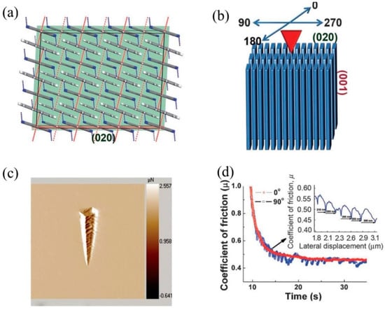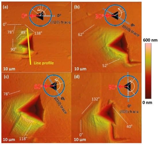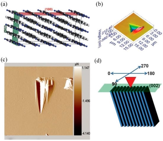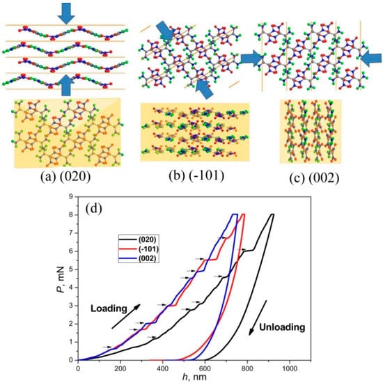 The above table shows that the molecular layer arrangement with respect to the (120) plane, which lies at an angle of ca. 12°, and the indenter axis, which is nearly normal to the slip plane. Therefore, pop-ins were not observed in the loading part of the P-h curve of the (120) (see Figure 11c). Further, the Schmid factor for the (120) planes was relatively smaller than the (011) and (001) planes; therefore, severe fracture (Figure 11d) was observed rather than slip [].