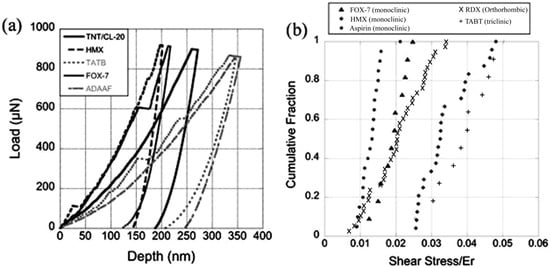Taw et al. [] used nanoindentation to measure the elastic and plastic properties of representative as-grown sub-millimeter orthorhombic, monoclinic, and triclinic molecular crystals. So far, researchers have performed nanoindentation on relatively large crystals, but this work used as-grown small crystals for nanoindentation. The as-received molecular crystals of TATB, cyclotetramethylenetetranitramine (HMX), FOX-7, azodiaminoazoxyfurazan (ADAAF), and a trinitrotoluene and 2,4,6,8,10,12-hexanitro-2,4,6,8,10,12-hexaazaisowurtzitane cocrystal (TNT/CL-20) were indented using a Berkovich indenter in this study. The results show that the onset of plasticity on the loading part of the P-h curve occurred consistently at a τ value between 1 and 5% of the elastic modulus in all of the crystal systems studied (see Figure 8). Further, the H to Er ratio observed in this study for different crystal systems suggested that the conventional Berkovich tips failed to generate fully self-similar plastic zones in organic crystals because the H/Er ratio varied in the present case from 0.039 to 0.044, whereas the model for fully plastic indentations of organic crystals suggested that the H/Er ratio should vary between 1 and 3. Therefore, the authors concluded that the indents performed by the Berkovich indenter in this study were more elastic [].