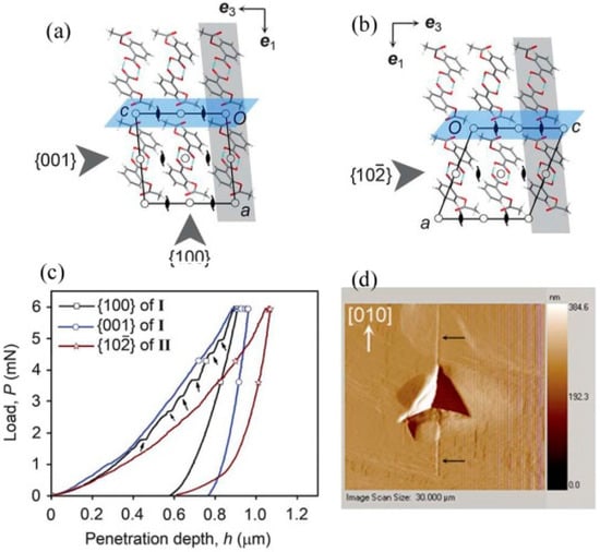 Varughese et al. [] utilized the nanoindentation technique to measure the mechanical properties of aspirin polymorphs and to understand the interaction characteristics and instability caused by τ. In both polymorphs, the carboxy groups formed centrosymmetric OH···O dimers and arranged as two-dimensional layers parallel to the (100) [,]. Although the crystal structures of the two forms are closely related, two distinct stabilizing CH···O interactions exist in form I [,]. They are: (1) the aromatic ring and the acetyl carbonyl group contacts, and (2) the methyl group and ester carbonyl group interactions. In contrast, in form II, the CH···O contacts between acetyl substituents of molecules related by a crystallographic 21 screw axis are the stabilizing interactions across the slip planes. Further, a small shift of adjacent layers parallel to one of the crystallographic axes relates form I and II structures (see Figure 9a,b) [,]. Nanoindentation was performed using a Berkovich tip with an end radius of 75 nm on the structurally equivalent {001} face of form I and the {102} face of form II (i.e., the indentation direction is normal to the potential slip planes but parallel to the interlayer shift direction that relates forms I and II). Upon loading, interestingly, while the loading parts of the P-h curves obtained for both the {001} of form I and the {102} of form II are smooth, pop-ins were seen on the {100} of form I, as shown in Figure 9c. The post-indent characterization on the {100} of polymorph I using scanning probe microscopy revealed a fracture along the [010] direction at higher loads, as shown in Figure 9d. Neither fracture nor pile-up was observed for either the {001} of form I or the {102} of form II. The softer nature of form II compared to form I was observed from the hmax. It was observed that the {001} of form I is 37% harder than the {102} of form II. The nanoindentation results justified the solid-state transformation of polymorph II to I if the samples were left under ambient conditions, but the process may be accelerateded with the application of τ.