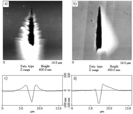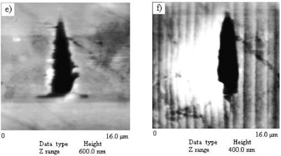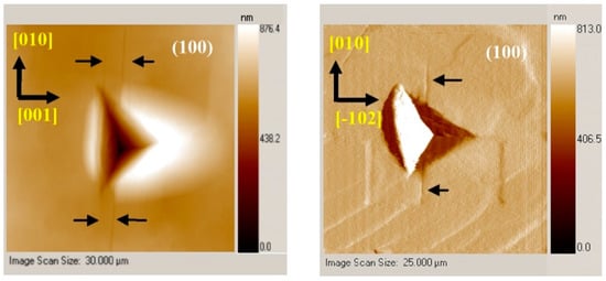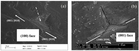 Olusanmi et al. [] investigated the anisotropic plastic deformation and fracture behavior of crystals of aspirin form I. While severe fracture was observed on the (001) plane, the (100) plane was found to be more fracture resistant, indicating that the (001) plane is the preferred cleavage plane for aspirin form I (see Figure 10a,b). The measured hardness on the (001) face was reported to be lower than the (100) face, indicating softer nature of the (001) face. Similar to the observation of Varughese et al. [], pop-ins were noted on both the (001) and (100) faces. However, deeper and more frequent pop-ins were seen on the (100) face. While the pop-ins on the (100) face were associated with cracking, the slip mechanism was responsible for the shallow pop-ins on the (001) face. Therefore, it was suggested that the cleavage planes in aspirin crystals dominate the fracture mechanism under both quasi-static and impact loading conditions.