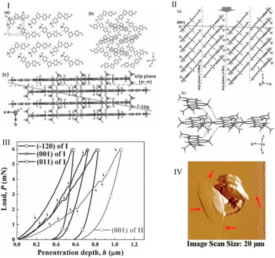 The crystals of organic molecules offer attractive physical properties that are different from the thermal, mechanical, optical, and electronic properties of conventional solids because of the presence of weak intermolecular interactions (such as van der Waals and dipole interactions, etc.) and the interplay between inter-and intramolecular degrees of freedom [,]. During the last decade, understanding the physics and mechanical deformation behavior of single crystals of organic molecules has become the subject of both theoretical and experimental researchers with the intention of exploring and exploiting them for various technological [] applications such as molecular electronics [] and pharmaceutics [,,,,,,,], etc. [,]. For example, in the pharmaceutical industry, the easy tableting and formulation of a drug solely depend on the mechanical properties of the bulk drug. Therefore, the establishment of structure-mechanical property relationships is key to designing and controlling the properties of molecular crystals in a more effective way []. In this review article, the authors have made efforts to summarize the recent advances in measuring and understanding the indentation-induced plastic deformation and fracture behavior of single crystals of a wide variety of organic molecules and pharmaceutical compounds, including the importance of hardness, H, measurement at the nanoscale, methods and models proposed and/or utilized to analyze and estimate the H of the crystals, factors affecting the H of organic crystals during small-scale testing, correlation of the mechanical properties to their underlying crystal packing, and fracture toughness studies.