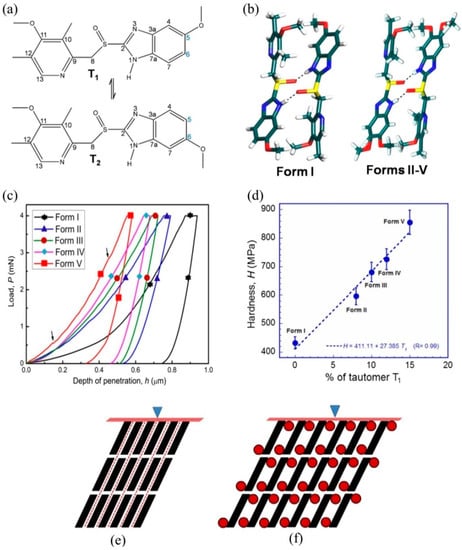 Mishra et al. [] focused on methods to tune resistance to plastic flow (hardness) in organic crystals. In the case of ductile inorganic materials such as metals etc., numerous strengthening methods (such as grain boundary strengthening in polycrystalline samples, precipitation hardening in alloy materials, and work hardening–deformation at low temperatures) were developed and understood very well. However, the methods mentioned above do not work in the case of organic crystals. Mishra et al. [] adopted an alternative method known as solid solution strengthening or hardening to tune the resistance to plastic flow in organic crystals. In the solid solution hardening method, the target hardness is achieved by mixing solute and solvent molecules in the desired concentration. Instrumented nanoindentation was employed on a series of omeprazole polymorphs (tautomeric forms of omeprazole are shown in Figure 12a,b), and revealed that proper design of the crystals using basic crystal engineering design principles leads to improving the lattice resistance to shear sliding of the molecular layers upon application of mechanical stress, thus increasing the organic crystals’ resistance to plastic flow []. A Berkovich tipped nanoindentation was performed on the major face {001} of five polymorphs of omeprazole. The characteristic P-h curves obtained from various polymorphs are shown in Figure 12c. The hardness values revealed that the hardness of polymorph V was nearly double that of polymorph I because of its layered structure and easy sliding nature during loading. However, despite having a similar layered structure in polymorphs II-V, they exhibited higher values of hardness because of the 5-methoxy group, which provides a higher resistance to shear sliding of molecular layers compared to polymorph I. The linear increase in hardness (see Figure 12d) in omeprazole polymorphic forms of I-V was attributed to the percentage of tautomer T1 in the polymorphs [].