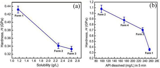 Mishra et al. [] investigated the correlation between the hardness and solubility of molecular crystals by performing nanoindentation on curcumin and sulfathiazole polymorphs. Among four sulfathiazole polymorphs, it was observed that polymorph I had the highest tendency to flow plastically upon mechanical pressure, and polymorph II was found to be the hardest because of the molecular layers that made a higher inclination angle with the indenter direction with respect to the different intermolecular interactions in I. In the case of curcumin, polymorph I was found to be the hardest because of the twisted molecular conformation in the crystal structure in comparison to polymorphs II and III, in which the closed cell parameters and planar structural packing allowed the polymorphs to deform plastically to a greater extent. The studies concluded that the hardness and solubility were inversely correlated in these polymorphs, as shown in Figure 14, indicating that the hardest polymorphs were less soluble and the softest were highly soluble. Further, the inverse relation suggested that the order of hardness can be utilized as a parameter to measure the solubility order in close energy-related polymorphic systems [].