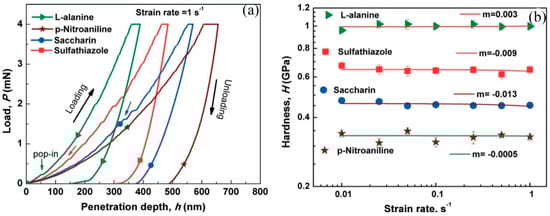 Several factors, such as indenter calibrations, vibration during testing, indenter shape, indentation size effects [], thermal drift [], machine compliance [,], and pile-up/sink-in [,], etc., affect indentation hardness values severely during the testing of molecular crystals.